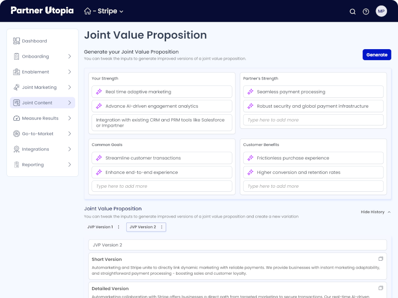 Craft a compelling joint story that aligns your brand voice, goals, and audience with your partner's. We consider every angle - your message, their message, and how to present it to the right audience for maximum impact. Sure, you could try to piece this together with generic AI, or you could let Partner Utopia handle it instantly.